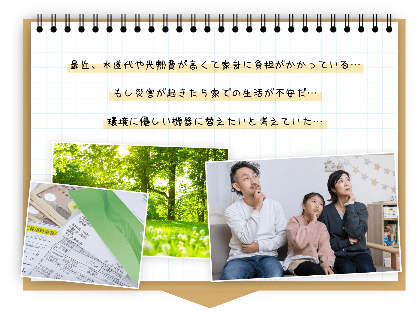 - 機器費用と工事費がかかり太陽電池の枚数や組み合わせによって異なります。詳しくはお問い合わせください。
